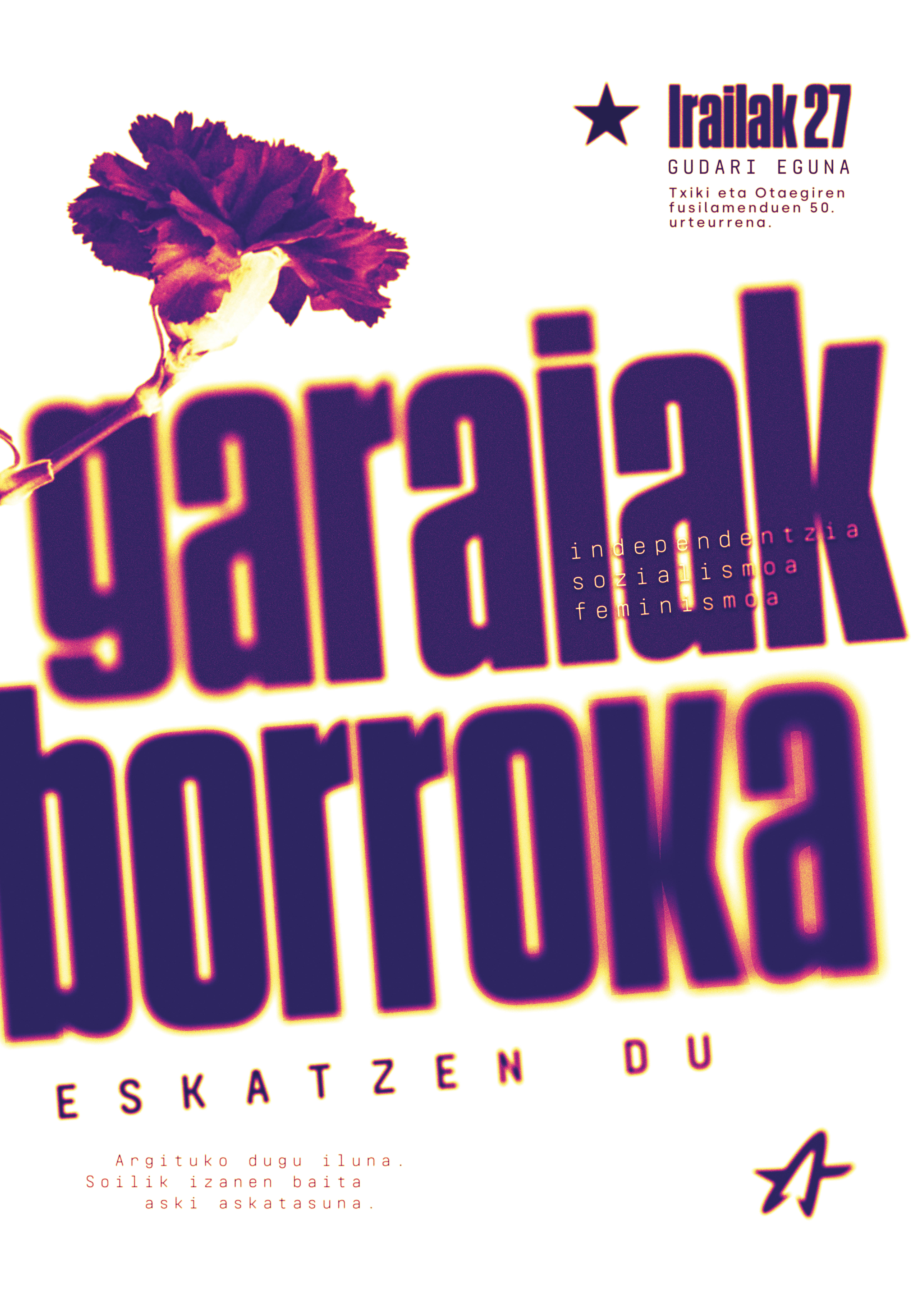 Aitzitik, ez da aski soilik borroka egitearekin. Irabaztea da xedea. Borrokaz irabaztea, alegia. Ez baitago borrokan joan zaizkigun herrikide guztiei egin diezaiekegun omenaldirik hoberik. Euren ametsak egi bihurtzea, euren borroka azken muturreraino eramatea. Baina batez ere, garaipenak soilik bermatuko digulako gazte zapaldurik biziko ez den Euskal Herria eraikitzea. Alegia, egun inoiz baino gehiago, independentzia, sozialismoa eta feminismoa dira gehiago mundu hobe baten funtsezko osagaiak.